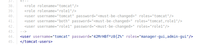 After creating a user we gain access to 2 repositories, seal_market and infra. Browsing the seal_market repo, we find the earliest commit which adds tomcat configuration. Taking a look at the seal_market / tomcat / tomcat-users.xml  file we find credentials for the tomcat application: